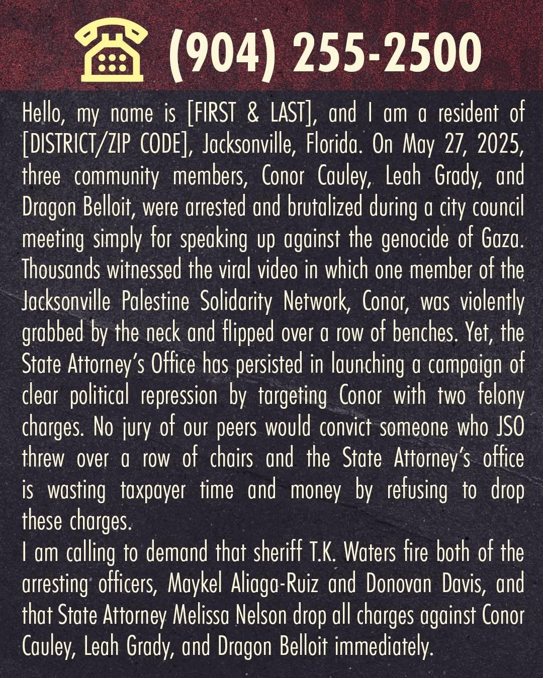 "Hello, my name is [FIRST NAME, LAST NAME], and I am a resident of [CITY, STATE]. On May 27, 2025, three community members, Conor Cauley, Leah Grady, and Dragon Belloit, were arrested and brutalized during a city council meeting simply for speaking up against the genocide of Gaza. Thousands witnessed the viral video in which one member of the Jacksonville Palestine Solidarity Network, Conor, was violently grabbed by the neck and flipped over a row of benches. Yet, the State Attorney’s Office has persisted in launching a campaign of clear political repression by targeting Conor with two felony charges. No jury of our peers would convict someone who JSO threw over a row of chairs and the State Attorney’s Office is wasting taxpayer time and money by refusing to drop these charges. I am calling to demand that sheriff T.K. Waters fire both the arresting officers, Maykel Aliaga-Ruiz and Donovan Davis, and that State Attorney Melissa Nelson drop all charges against Conor Cauley, Leah Grady, and Dragon Belloit immediately."